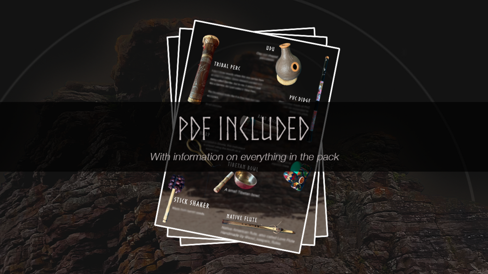 Bodhrán, Bongo, Bowed Strings, Cow Bells, 2 types of Didgeridoo and at multiple pitch, Doumbek, Metal Chair, Rain Stick, Shakers, Native American Flute, Jew Harp, Stick Shaker, Throat Singing, Tingsha, Tibetan Bowl, Tribal Perc, Udu, UB802, Ambiances, FXs, Hi-Hats, Kick Drums, Loops...